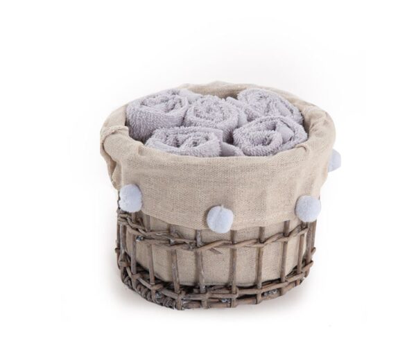 • Καλαθάκι με υφασμάτινη επένδυση διακοσμημένο με pom pom που περιλαμβάνει 5 τεμάχια λαβέτες, διάστασης 30x30cm.
