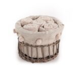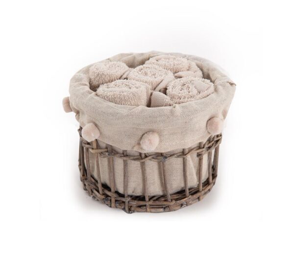 • Καλαθάκι με υφασμάτινη επένδυση διακοσμημένο με pom pom που περιλαμβάνει 5 τεμάχια λαβέτες, διάστασης 30x30cm.